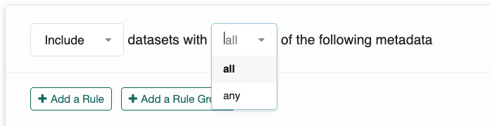 Additionally, you can define how your rules should include or exclude datasets from your collection (Figure 10).  Choose (1) whether rules should include or exclude datasets, as well as (2) whether datasets should meet all rules (this is an AND boolean operation) or any rules (this is an OR boolean operation).