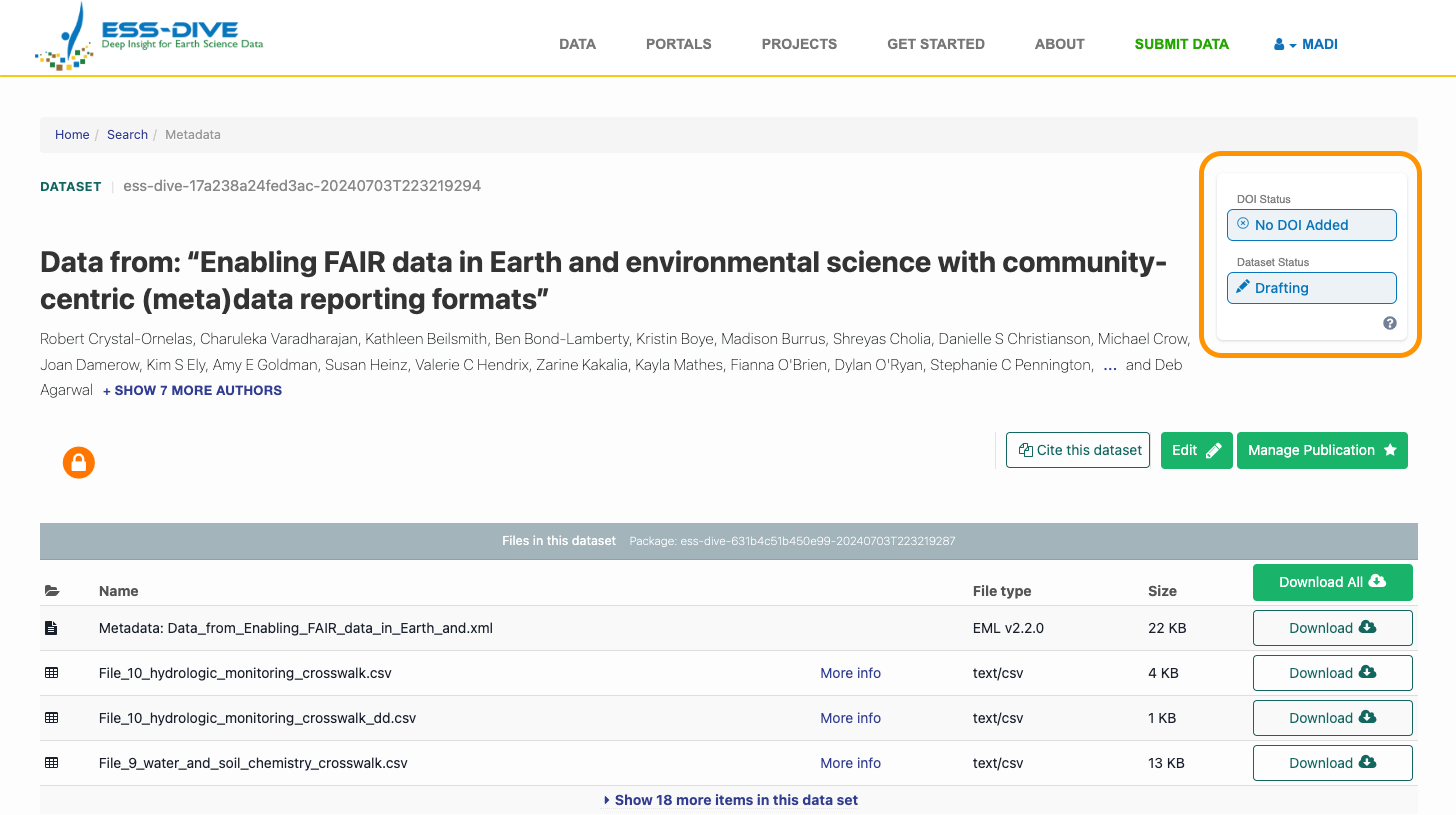 **The DOI status captures the state of the DOI associated with the dataset** (see Table 2)**.** DOIs can be reserved before publication or assigned upon publication by ESS-DIVE using either a new or existing DOI.